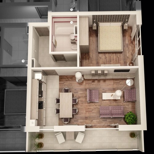 Locuinta este amplasata la parter, compartimentata astfel: living cu bucatarie tip open space, hol, baie, dormitor, balcon.