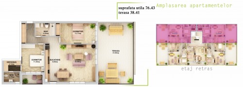 Locuinta dispune de o suprafata utila de 76 mp, 3 mp balcon si 38 mp terasa.