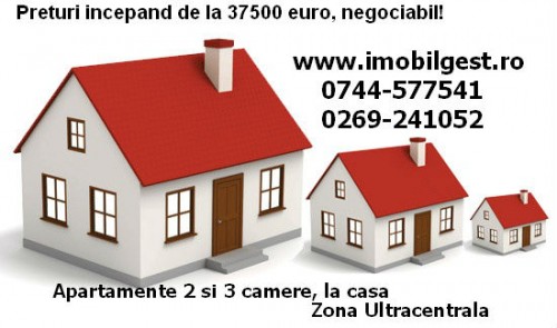 De vanzare apartamente cu 2 si 3 camere, la casa, zona Ultracentrala. Preturi incepand de la 37500 euro, negociabil! Pentru detalii si oferte contactati-ne la nr de tel: 0744-577541 sau 0269-241052, www.imobilgest.ro