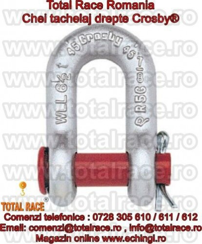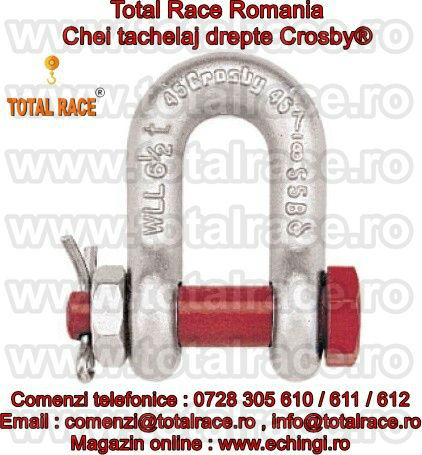 Total Race Romania comercializeaza gambeti tip lira / drept marca Crosby, chei tachelaj dreapte cu bolt filetat, gambeti tip lira , shackles Crosby ce au capacitati cuprinse intre 0.5 Tone si 55 Tone . Au factor de siguranta: MBL = 6 x WLL (Sarcina maxima de lucru), material otel aliat , galvanizat la cald ( Forjat- Calit si Temperat ). Capacitatea este stantata permanent pe shackles . Cheile de tachelaj Crosby se livreaza cu certificate de calitate CE de la producator.