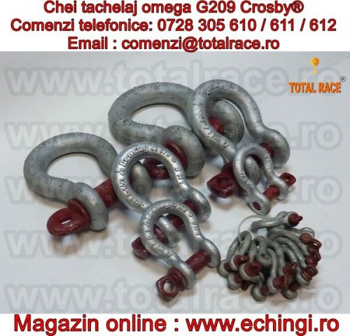 Total Race livreaza din stoc Bucuresti chei de tachelaj omega model G209 din otel carbon marca Crosby, produse galvanizate la cald, chei de tachelaj cu marcaj CE rezistente la uzura , capacitate de ridicare stantata permanent pe fiecare cheie de tachelaj, echipamente de ridicare cu chei de tachelaj omega,, gambeti de ridicat omega, gambeti accesorii, aceesorii pentru dispozitive de ridicare, dispozitive din lant cu brate si chei de tachelaj omega. Cheile de tachelaj Crosby® se livreaza cu certificate de calitate CE de la producator. Pentru detalii accesati: www.echingi.ro & www.cheitachelaj.ro