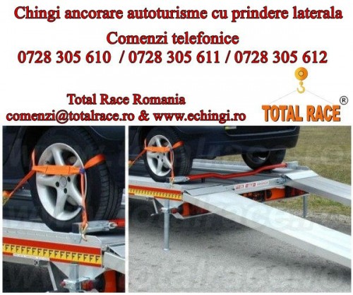 Total Race Romania comercializeaza cu livrare din stoc Bucuresti chingi auto, sufe auto, chingi de ancorare autoturisme pe platforma cu prindere laterala, latime de banda 50 mm , Lc 2500 daN / Lc 5000 daN , lungime totala chinga L = 4 m , cu carlige la capete tip gheara duble sau simple, productie Olanda , culoare portocalie. Chingile de ancorare cu prindere laterala sunt fabricate din poliester 100 %, sunt in conformitate cu EN 12195-2. Chingile de asigurare autoturisme pe vehicule de transport cu prindere laterala sistem 50 mm asigura o montare rapida, usoara si sigura a autovehiculelor pe platforma auto.