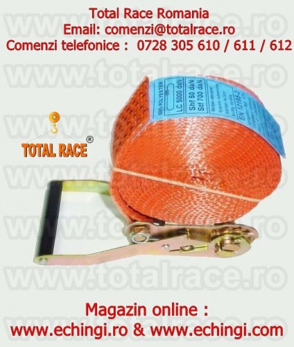 Total Race livreaza din stoc Bucuresti chingi ancorare marfa capacitate 5 tone , chinga ancorare marfa cu latimi de banda intre 25 mm – 100 mm , chingi ancorat sarcini cu carlige ancorare tip gheara duble , gheara simplu , carlige cu siguranta , carlige triunghi , sisteme de arimare cu capacitate de ancorare Lc 2500 daN drept si Lc 5000 daN peste incarcatura, elemente de fixare si ancorare a incarcaturii pentru camioane .