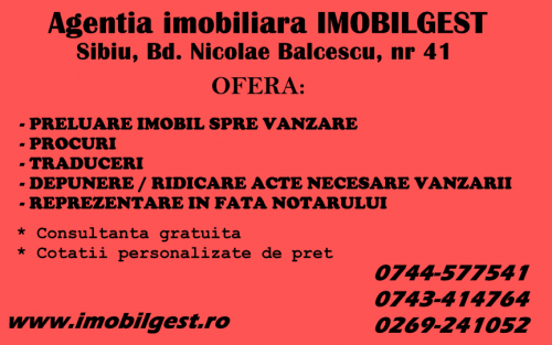 Agentia imobiliara Imobilgest din Sibiu intermediaza vanzari imobile in toata tara. Daca esti plecat in strainatate sau nu ai timp sa te ocupi de vanzarea proprietatii tale noi te ajutam! Experienta vasta in domeniu! Pentru detalii nu ezitati sa ne contactati la nr: 0744-577541, 0743-414764 sau 0269-241052, www.imobilgest.ro