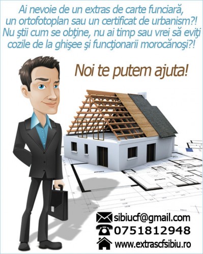 AI NEVOIE DE UN EXTRAS DE CARTE FUNCIARA , UN ORTOFOTOPLAN SAU UN CERTIFICAT DE URBANISM ?!COMPLETEAZA ACUM CEREREA ON-LINE PE http://extrascfsibiu.ro/ SI PRIMESTI DOCUMENTUL DIRECT IN MANA ORIUNDE IN ORASUL SIBIU ! FARA BATAI DE CAP , TIMP PIERDUT LA COZI INTERMINABILE SI NERVI INUTILI ! RAPID , EFICIENT , LA INDEMANA !