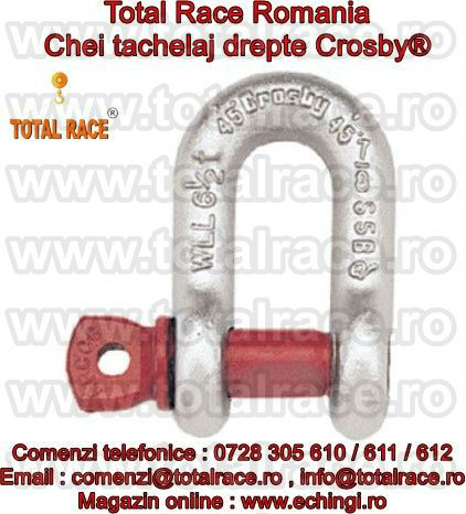 Total Race Romania comercializeaza chei de tachelaj tip lira / drepte marca Crosby, cheie tachelaj dreapta cu bolt filetat, gambeti tip lira , shackles Crosby ce au capacitati cuprinse intre 0.5 Tone si 55 Tone . Cheile de tachelaj sunt in conformitate cu EN 13889:2003 si indeplinesc cerintele de performanta ale Fed. Spec. RR-C271D tip IVA, grad A, Clasa 2. Au factor de siguranta: MBL = 6 x WLL (Sarcina maxima de lucru), material otel aliat , galvanizat la cald ( Forjat- Calit si Temperat ). Capacitatea este stantata permanent pe shackles . Cheile de tachelaj peste capacitate WLL= 25 Tone sunt echipate RFID.