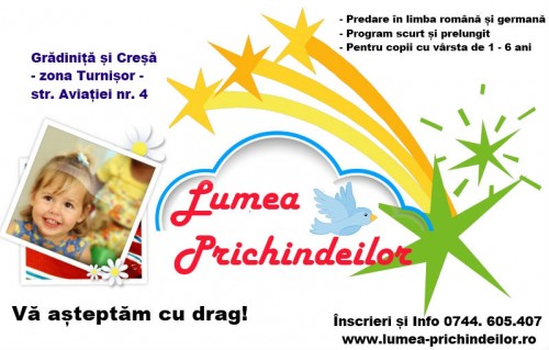 Cresa si Gradinita Lumea Prichindeilor (Sibiu/Turnisor) continua inscrierile, atat pentru copii de varsta anteprescolara, cat si prescolara. Program scurt si prelungit pentru copii cu varsta de la 1 la 6 ani. Predare bilingva (romana/germana), dotari exceptionale si personal de specialitate calificat.