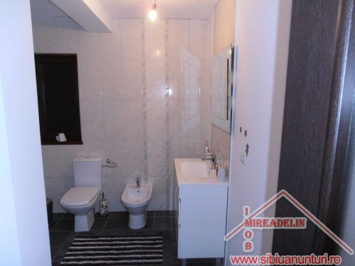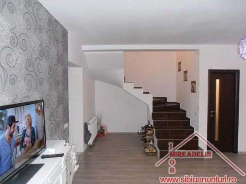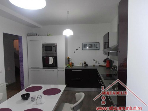 Inchiriez casa cu 4 camere, situata pe Calea Cisnadiei, constructie noua, cu o suprafata utila de 110 mp. Se inchiriaza complet mobilat si utilat. Compartimentarea este dispusa astfel: la parter se afla livingul (cu semineu), bucataria, holul, scara interioara, debara si baie spatioasa (cu geam de aerisire si cabina de dus), la etaj, 3 dormitoare decomandate (unul cu dressing) fiecare beneficiaza de cate un balcon, hol, baie mai spatioasa (cu geam aerisire si cada), scara modulara pentru accesul in pod. Imobilul detine curte interioara proprie. Imbunatatiri si finisaje: geamuri termopane, parchet, gresie, faianta, CT proprie, izolatie exterioara, tapet, vopsea decorativa. Alte dotari: acces cablu, curent, apometru, canalizare, contor gaz. Imobilul se inchiriaza la pretul de 500 euro neg.