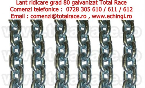 Total Race Romania comercializeaza cu livrare din stoc Bucuresti : lant ridicare grad 80 galvanizat, lanturi ridicat sarcini grad 80 electrogalvanizate – rezistenta mare impotriva ruginii , lant cu zale scurte pentru ridicat sarcini grad 80 in conformitate cu EN 818-2 , lant de ridicare cu coeficient de siguranta 4:1 , lant galvanizat culoare argintie , lanturi galvanizate de ridicare cu diametru lant intre 6 mm si 16 mm , lant galvanizat 6 mm 1,12 tone, lanturi galvanizate 7 mm 1.5 tone, lant ridicare galvanizat 8 mm 2 tone, lant ridicare galvanizat 10 mm 3.15 tone , lant galvanizat 13 mm 5.3 tone , lant ridicare galvanizat 16 mm 8 tone – lanturi galvanizate cu livrare uzual din stoc Bucuresti , dispozitive de ridicare cu ramuri , sisteme de ridicat din lant galvanizat. Detalii : www.echingi.ro & www.totalrace.ro & www.echingi.com