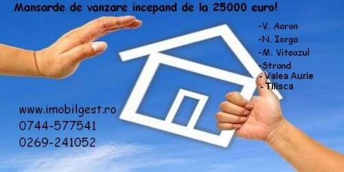 Oferim spre vanzare apartamente cu 2 si 3 camere, la mansarda. Preturi incepand de la 25000 euro! Pentru mai multe detalii accesati site-ul www.imobilgest.ro sau contactati-ne la nr de tel: 0744-577541 sau 0269-241052