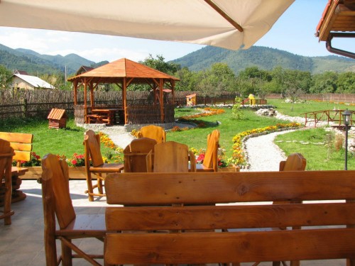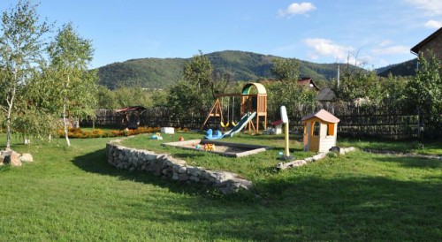 Pensiunea dispune de o curte foarte generoasă, cu o gradina amenajata, parcare, alei pietruite flancate pe alocuri de flori şi arbuşti, gazon şi câţiva pomi fructiferi, locuri de joacă pentru copii (cu groapă de nisip, tobogane, leagăne, căsuţe suspendate), filigorie, grătar, fântână şi căruţă de decor, terasă cu măsuţe, semineu.
