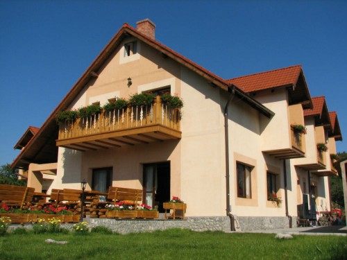 DESCRIERE: Situata la doar 50 m de drumul principal, pensiunea este construita pe un teren de aproximativ 3000 mp, avand o suprafata construita de 600 mp fiind dispusa pe Parter+Etaj (300 mp pe nivel), si dispune de 9 spatii de cazare, cu baie proprie, dintre care doua apartamente la parter, mobilate si utilate cu pat matrimonial (si fotolii-pat pentru copii) si 7 camere duble la etaj, cu balcoane generoase, cu o privelişte superbă asupra munţilor Cindrel şi a dealurilor de la poalele acestora.