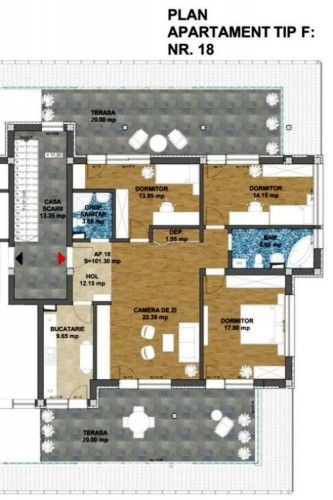 Imobilul beneficiaza de o suprafata utila de 101 mp + 40 mp terase.