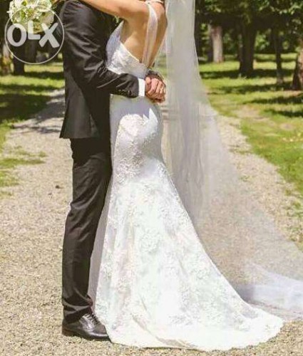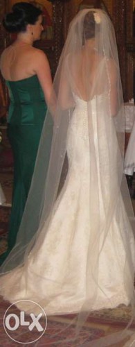 Rochie mireasa, unicat, facuta la comanda, model sirena, cu trena, spatele gol, dantela fina deosebita, stare foarte buna, culoare alb spre crem, marimea S, se vinde fara voal, pret usor negociabil