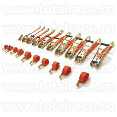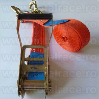 Uzual in stoc Bucuresti chingi de ancorare sistem 50A mm cu latime banda 50 mm , in conformitate cu EN 12195 – 2 , elongatie < 7 % cu clichet Stf 350 daN, din 2 parti , carlige diverse modele(de exemplu carlige ancorare tip gheara duble , gheara simplu , carlige cu siguranta , carlige triunghi ), din poliester, culoare portocalie, 5 dungi negre. Capacitatea de ancorare este Lc 2500 daN drept si Lc 5000 daN peste incarcatura, eticheta ancorare – date de identificare produs.