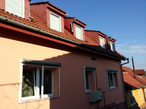 Corpul principal are la subsol pivnita de 8 mp, la parter hol, bucatarie 16 mp, camera 20 mp., baie 12 mp , iar la mansarda 3 dormitoare, la doua din ele cu balcon.