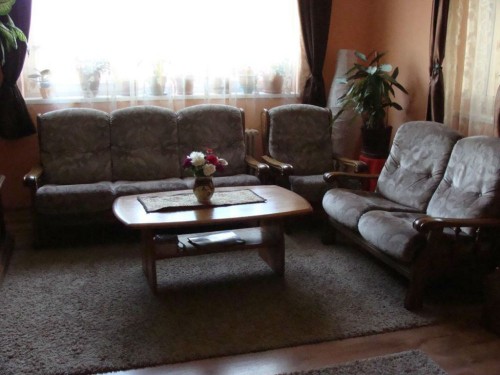 – doua canapele de trei, respectiv doua locuri si un fotoliu, toate compunand un set de sase locuri cu bratele de lemn;