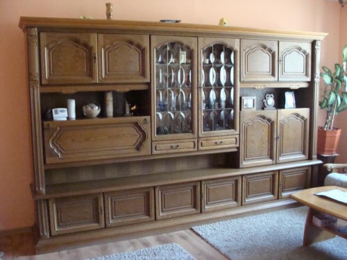 – mobila cu usi din lemn, extrem de spatioasa, utila, compusa dintr-o vitrina, multiple dulapioare si sertare;