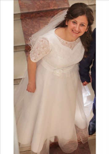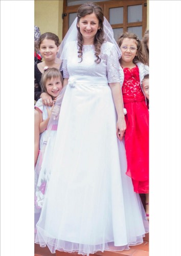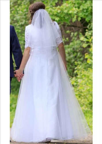 Rochie de mireasa din saten, dantela si tull culoare alba alba, decenta, simpla, model pear, purtata o data, stare impecabila, marimea Medium/Large (40-44)
